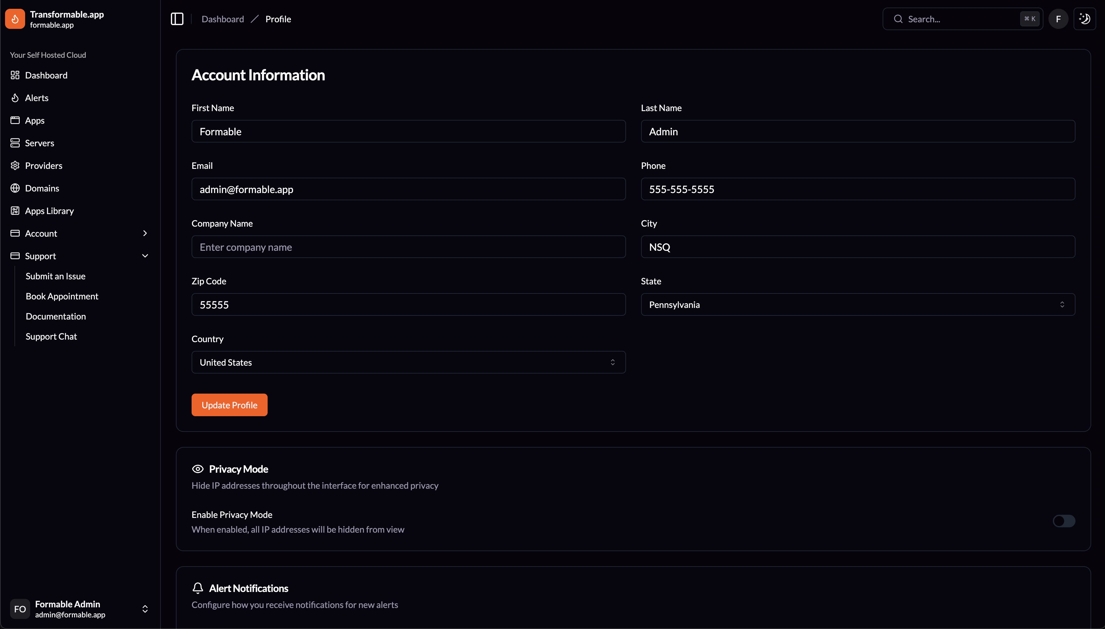 It's easy to keep your account and contact information updated. Also if you set a Company Name, the interface will show your company name next to the logo in the top bar.